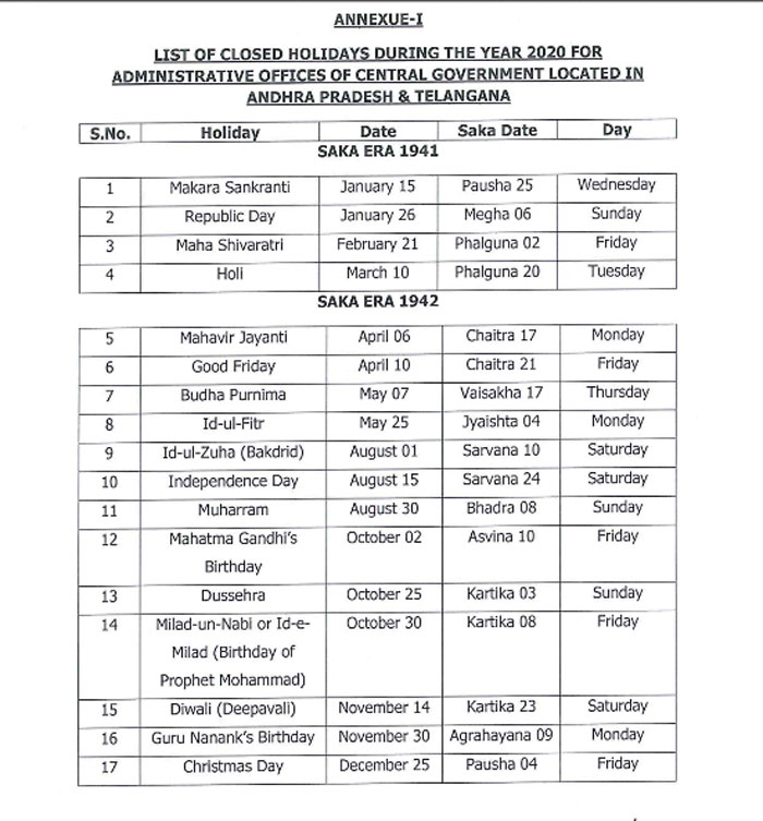 Andhra pradesh govt has released notification regarding list of govt holidays for 2020 including optional holidays and festivals. In addition to the above mentioned general. The government of andhra pradesh direct that the days specified in annexure i shall be observed as general holidays by all the state government offices excluding the holidays falling on sundays shown in annexure i a and optional holidays shown in.