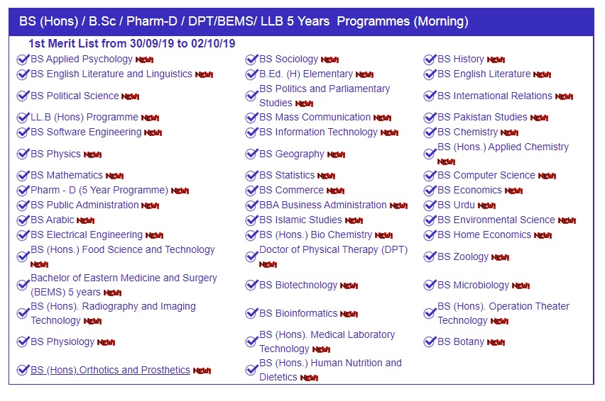 This university have complete admission procedure and all students get admission on merit here. View latest merit list 2020 details for all top schools colleges and universities in pakistan. The merit will be calculated on the basis of entry test scores and previous class marks obtained.