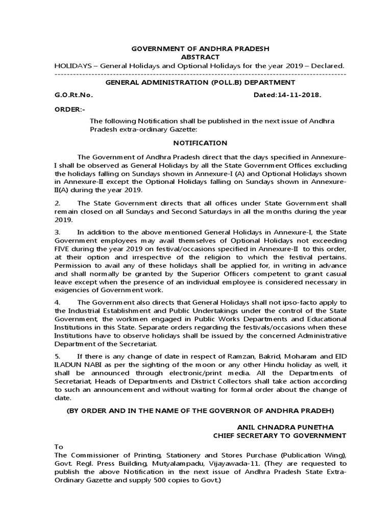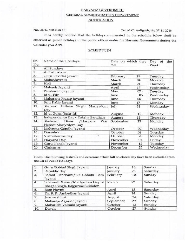 Government holidays for 2019 the following is a list of designated paid holidays for 2019 and the dates which they will be observed by employees working daily hours monday friday. These dates may be modified as official changes are announced so please check back regularly for updates. The central government employees in new delhi and outside the capital city shall observe the following list of holidays.
