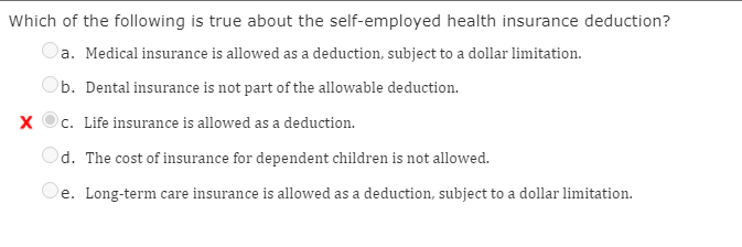 The self employed health insurance deduction applies to health insurance premiums for yourself your spouse and your dependents. This includes dental and long term care coverage. Self employed health insurance deduction.