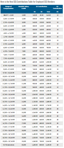 There are 37 monthly salary credits beginning from 2000 pesos and increasing in increments of 500 pesos up to the maximum of 20000 pesos as of the latest sss contribution table effective april 2019. Your employer should shoulder the 73670 10 ec and the remaining 36330 is your contribution which is deducted from your monthly salary. The 11 rate is being shared by the employee 363 and the employer 737.